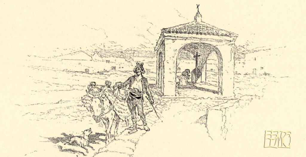 El último dato gráfico del que pudiera tenerse sobre el humilladero es un dibujo de Daniel Urrabieta Vierge realizado en 1893 para un libro de viajes del estadounidense August F. Jaccaci, On the trail of Don Quixote, cuando ambos estuvieron por estas tierras. Aunque realizó hasta un total de siete dibujos de la localidad, uno de ellos llama poderosamente la atención por sus innegables parecidos a un humilladero, aunque al pie del dibujo solo reza una breve descripción que dice “un suburbio de Alcázar de San Juan”, sin hacer mención alguna relativa a que esa construcción fuera el humilladero, aunque queda claro que estaría a las afueras de la ciudad. Pero por las características que presenta el dibujo no cabría duda al respecto: una pequeña construcción cuadrada y techada, con cuatro arcos que dan acceso a su interior en el cual se encuentra una cruz y en la que si se observa atentamente se aprecia a una mujer de rodillas delante de esta.