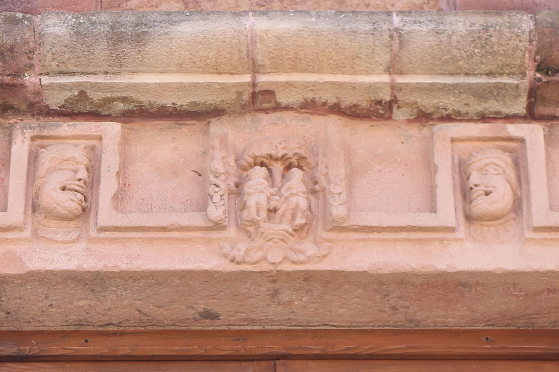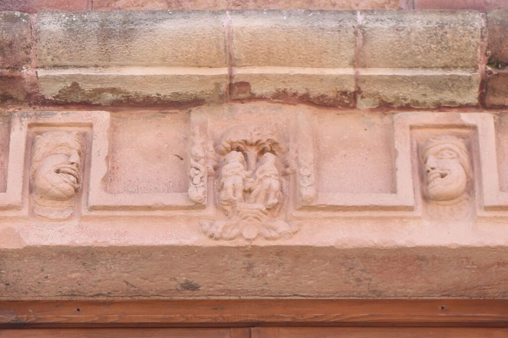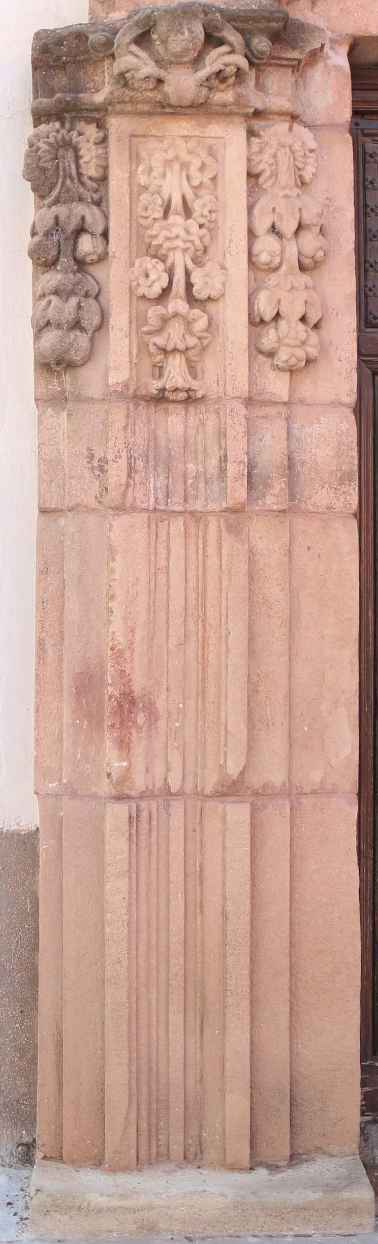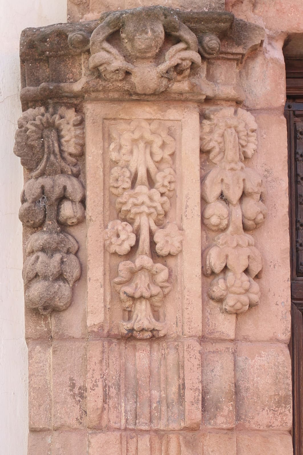 En el cuerpo medio nos encontramos un balcón con reja castellana, una puerta doble adintelada rodeada de pilastras también cajeadas; en los extremos del dintel la ornamentación es geométrica; rombos insertos en una caja con líneas de escamas acompañados en la parte inferior por dos líneas de gotas semicirculares. Presiden el centro Adán y Eva delante del árbol del pecado, y situados a ambos lados dos rostros de clara influencia indígena con grandes bocas enseñando los dientes que dirigen su vista hacia aquéllos.