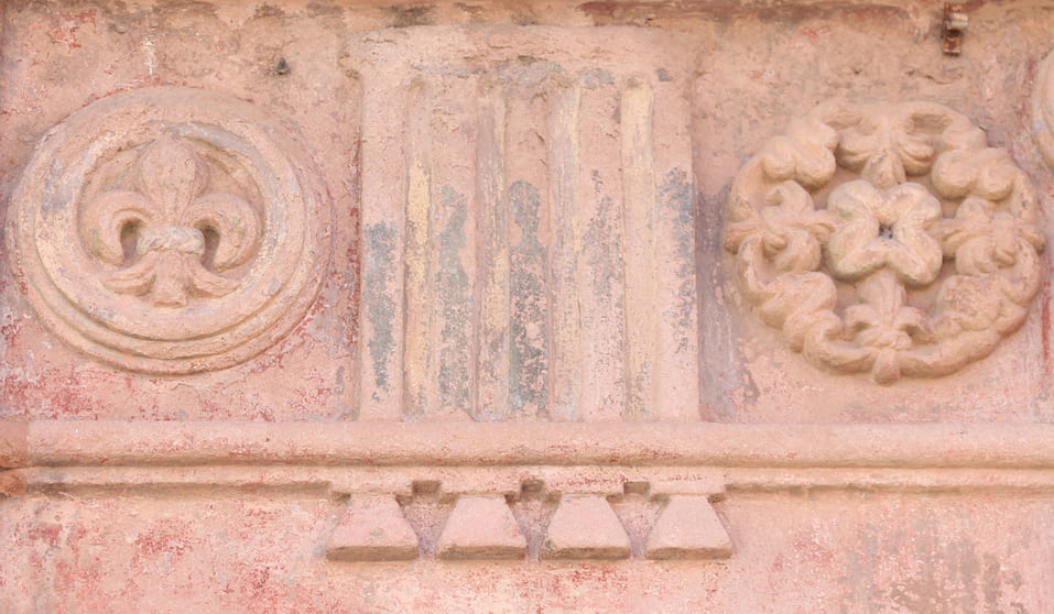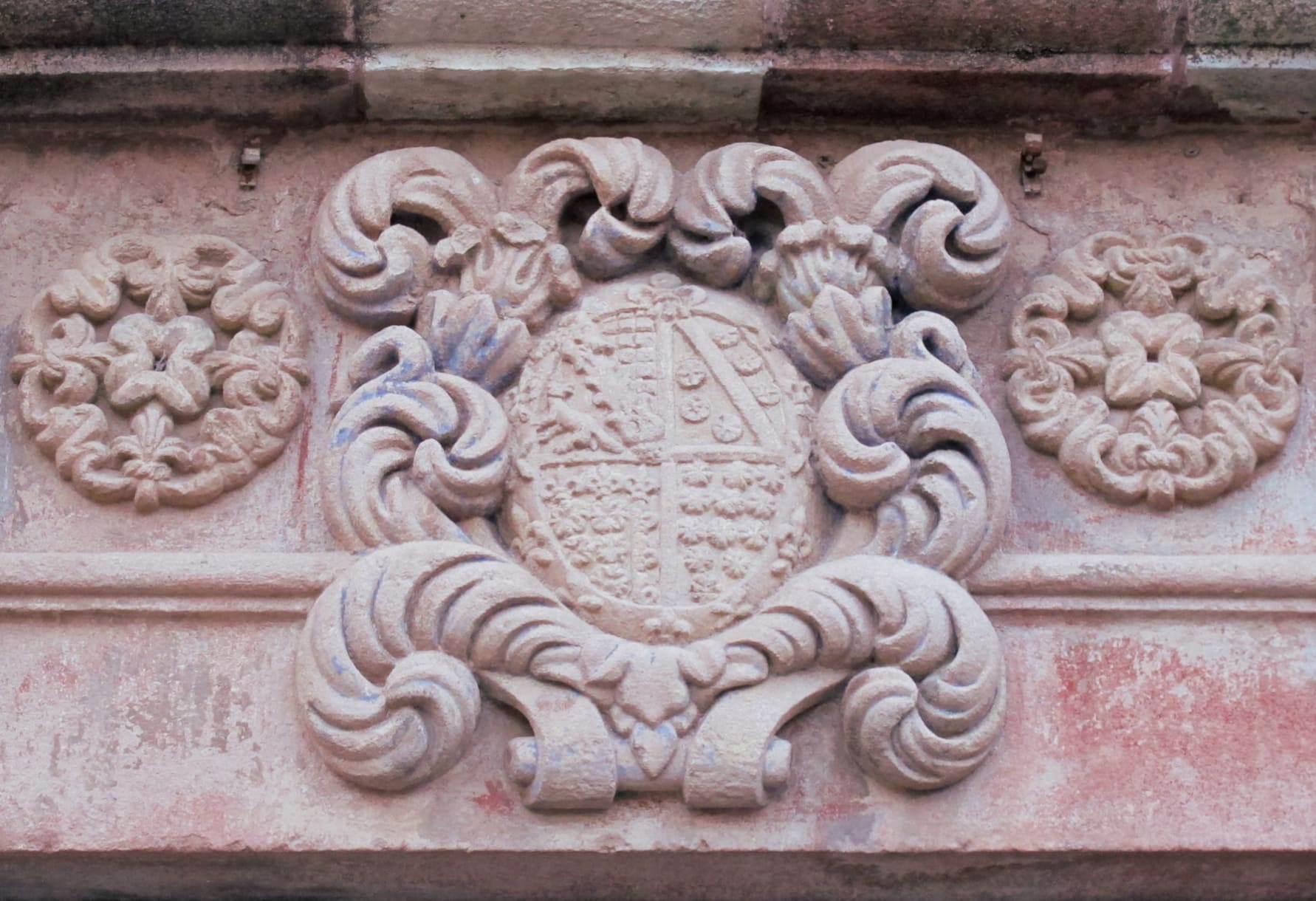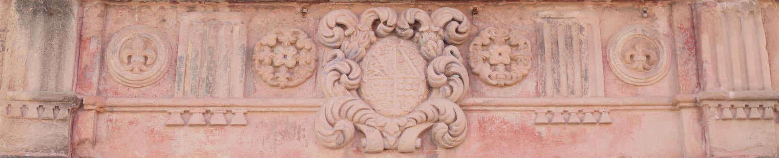 La fachada consta de tres partes: en el cuerpo inferior vemos un portón enmarcado por pilastras cajeadas con decoración a candelieri y el dintel a modo de friso de los templos griegos; tiene triglifos con gotas y metopas decoradas con cuatro tondos, dos con cuadripétalos y flores de lis y los otros dos flordelisados. Ocupa el centro de la composición un pequeño escudo de armas cuartelado en cruz y rodeado de elementos vegetales