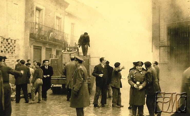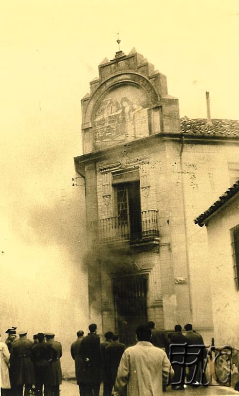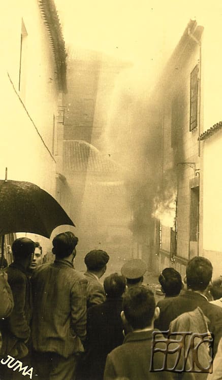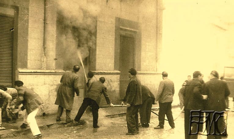 El incendio de la cooperativa se produce el 5 de febrero de 1960, a las 3 de la tarde, en la festividad de Santa Águeda, como consecuencia, quedó destruida la mayor parte del edificio social, con sus instalaciones, enseres, mercancías y documentación. En la caja de caudales se encontraban los documentos más importantes como el reglamento original, sus estatutos y suplementos adicionales, y al permanecer aquella, durante unos días entre los escombros calcinados, se le abrió una grieta, afectando el fuego a la documentación que había en el interior; aún se conserva el reglamento original, pero son ilegibles muchas de sus hojas y otras se deshacen al contacto con los dedos. La causa pareció ser un cortocircuito que provocó el fuego que se propagó muy rápidamente, pues todo el interior del edificio era de madera: estanterías, muebles, mostradores, etc. Mientras que los muros exteriores quedaron intactos. La primera Junta después del incendio se hizo el 29 de febrero en los locales de las Escuelas Ferroviarias en la calle Goya número 1. En esta Junta se destacó el interés y colaboración de todas las autoridades civiles, militares e incluso eclesiásticas, así como muchos particulares, ofreciendo su apoyo para tratar de reorganizarse rápidamente.