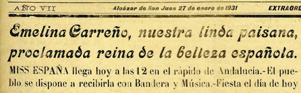 Titular de “El Despertar”, del 27 de enero de 1931 donde se proclama a Emelina Carreño ¨Miss España”. Hemeroteca del Archivo Municipal de Alcázar de San Juan.