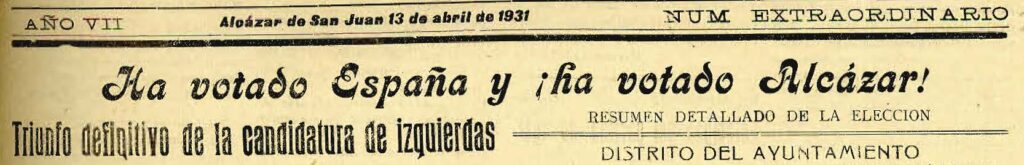 Las elecciones municipales, celebradas el 12 de abril de 1931, se rigieron por la Ley Maura de 1907 donde podían votar los varones mayores de 25 años, vecinos de la comarca. Lo cierto es que las elecciones se llevaron a cabo con total normalidad. La campaña electoral fue animada, pero sin episodios de violencia o enfrentamientos a reseñar. Nada que desbordara los cauces del diálogo político en el Alcázar de aquellos meses de entre enero y abril de 1931(1). La jornada electoral fue tranquila y no hubo que resaltar ningún episodio reseñable: “Ha sido sencillamente una lección de cultura y honradez ciudadana“(2) La mayor inquietud que tuvieron los alcazareños fue la derrota, ese mismo día, en el campo de la Puerta de Granada, del C.D. España frente al CD. Manchego de Ciudad Real, en un pésimo partido de los visitantes, en una tarde fría, desapacible y gris de viento huracanado que no invitaba precisamente a las florituras deportivas. El resultado: Deportivo Manchego Uno: CD España: Cero. El gobierno monárquico que confiaba en la victoria asistió atónito a los resultados que daban como perdedora a las opciones monárquicas en las grandes ciudades. La participación fue de un 66, 9 % del electorado; de las 50 capitales de provincia, 41 se habían manifestado a favor de la república. El propio Romanones dijo, al conocer los resultados de su ciudad. Guadalajara: “Cincuenta años de vida política se desvanecían como el humo”(3). La participación de los alcazareños en las elecciones municipales del 12 de abril fue masiva, votando el 73, 9 % del censo electoral. El resultado fue muy claro, con una victoria rotunda de la Conjunción de Republicanos Socialistas con casi el 64% de los votos, con 8 concejales socialistas y seis para el Partido Radical Socialista, venciendo en los cuatro distritos (Ayuntamiento, San Francisco, Estación y Trinidad).