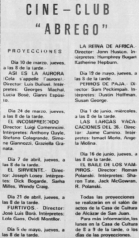 En los 80 destacamos el Cine Club Ábrego que se realizaba en el salón de actos de la antigua Casa de la Cultura en la calle Jesús Romero, ya en los 90 nos encontramos con el cine de verano promovido por el propio Patronato Municipal de Cultura, realizándose esta vez en la Plaza de toros, Enrique Molina antiguo propietario del cine Alcázar, fue el que cedió el equipo de proyección al Ayuntamiento para que se pudiera llevar a cabo esta iniciativa, teniendo una gran acogida por parte del público en general.