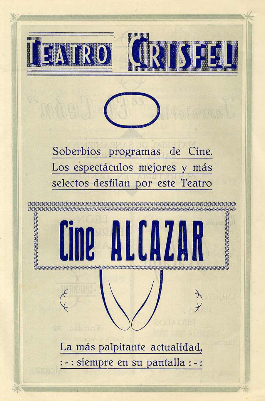 Aunque el edificio más longevo y que todavía sigue en pie, lo encontramos con la inauguración de la Zarzuela “Las bribonas” de Rafael Calleja, era cuando comenzaba su andadura el teatro “Cinema Moderno” o Teatro Moderno, que luego conoceríamos como “Cine Crisfel”, nacía en 1909 en concreto un miércoles 8 de septiembre, primer día de la feria de las de entonces, donde también era muy común en los años 20 hacer funciones de cinematógrafo al aire libre coincidiendo con estas fechas de feria en la plaza de Santa Quiteria.